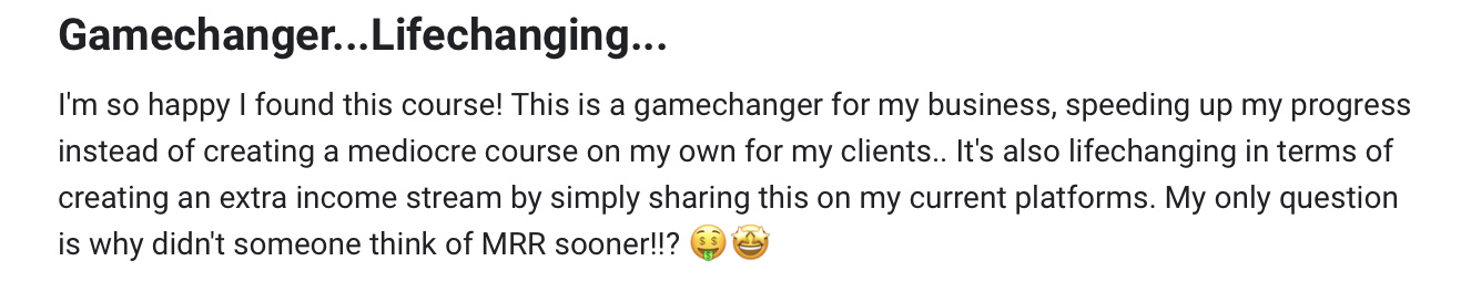 MRR stands for "Master Resell Rights" and it is a legal clause attached to the course that allows you to resell it for 100% profit. Simply, if you like the course & think it's valuable - you can also sell it to your audience for an additional stream of income!